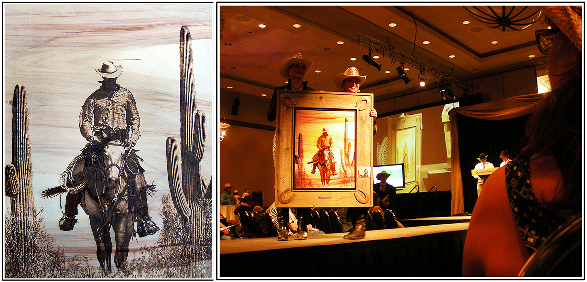 His pyrography works are highly sought after by overseas art institutions and private collectors. His representative work The Lone Cowboy was widely acclaimed and pursued by international collectors at international art auctions.