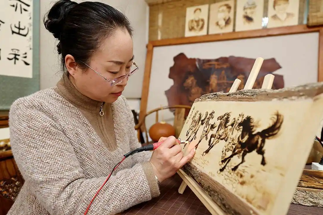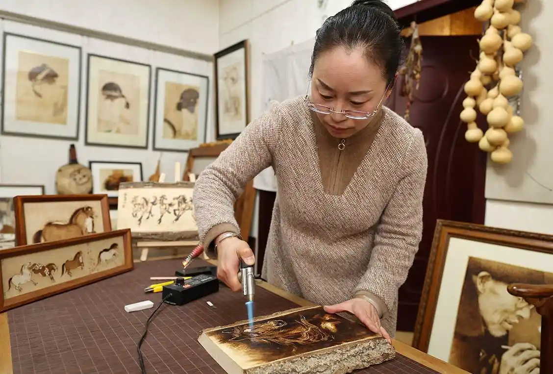 Li Cailan, a pyrography artist and inheritor of intangible cultural heritage, is a top-notch talent among the new literary and artistic groups of the China Federation of Literary and Art Circles, a national vocational skills competition referee of the China Disabled Persons' Federation, a master of arts and crafts in Shaanxi Province, and a painter of the Shaanxi Academy of Calligraphy and Painting for All Circles.